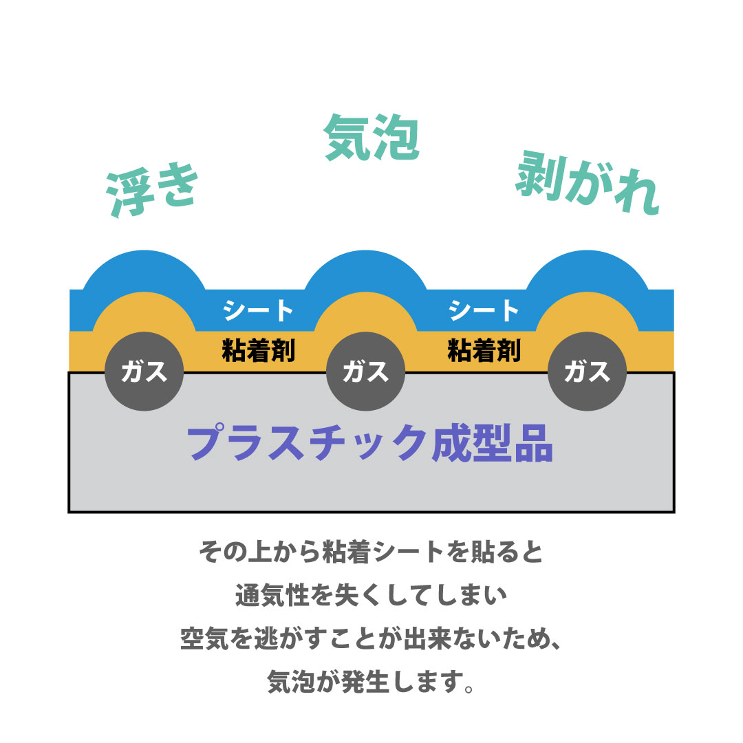 はじめにきれいに貼ることができても、しばらくするとガス(アウトガス)がプラスチックや塩ビ板はから放出されるため、シートとプラスチックの間に気泡ができ、表面がぼこぼことした状態になってしまう可能性があります。