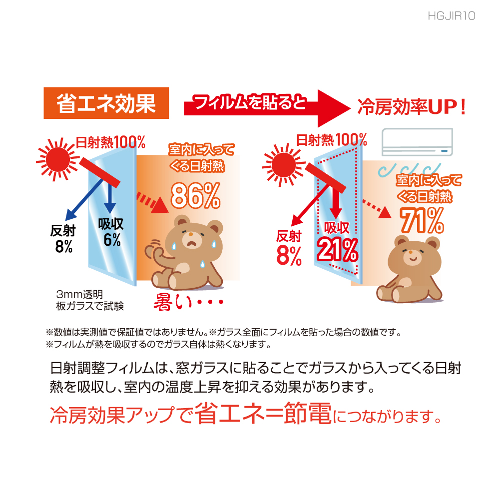 日射調整するので、窓ガラスに貼ることでガラスから入ってくる日射熱を吸収し、室内の温度上昇を抑える効果があり「省エネ=節電」になります。